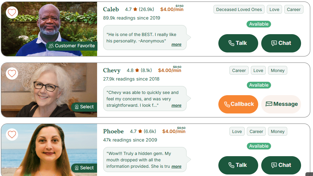 California Psychics offers a large network of 350+ psychics and is known for its long-standing reputation in the industry. It focuses mainly on live chat and call-based readings, making it suitable for users who prefer traditional psychic consultations.