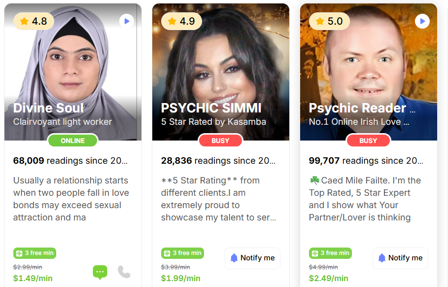 Kasamba is one of the most widely used platforms, offering a mix of affordability and promotional benefits for new users. It is especially popular among first-time psychic seekers.